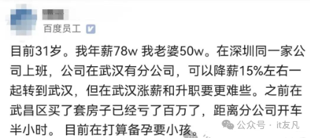 对这问题其实不难做选择,在深圳待遇很不错,这个收入在深圳买房问题不大,只是看自己还能工作多久,是否想留在深圳发展。每个人对城市的感情不一样,喜好不一样,多赚点钱深圳更好,去分公司才降薪15%,这等于没降,而且武汉生活成本低,自己还有房,去公司通勤近,还打算要小孩,那武汉绝对值得回。