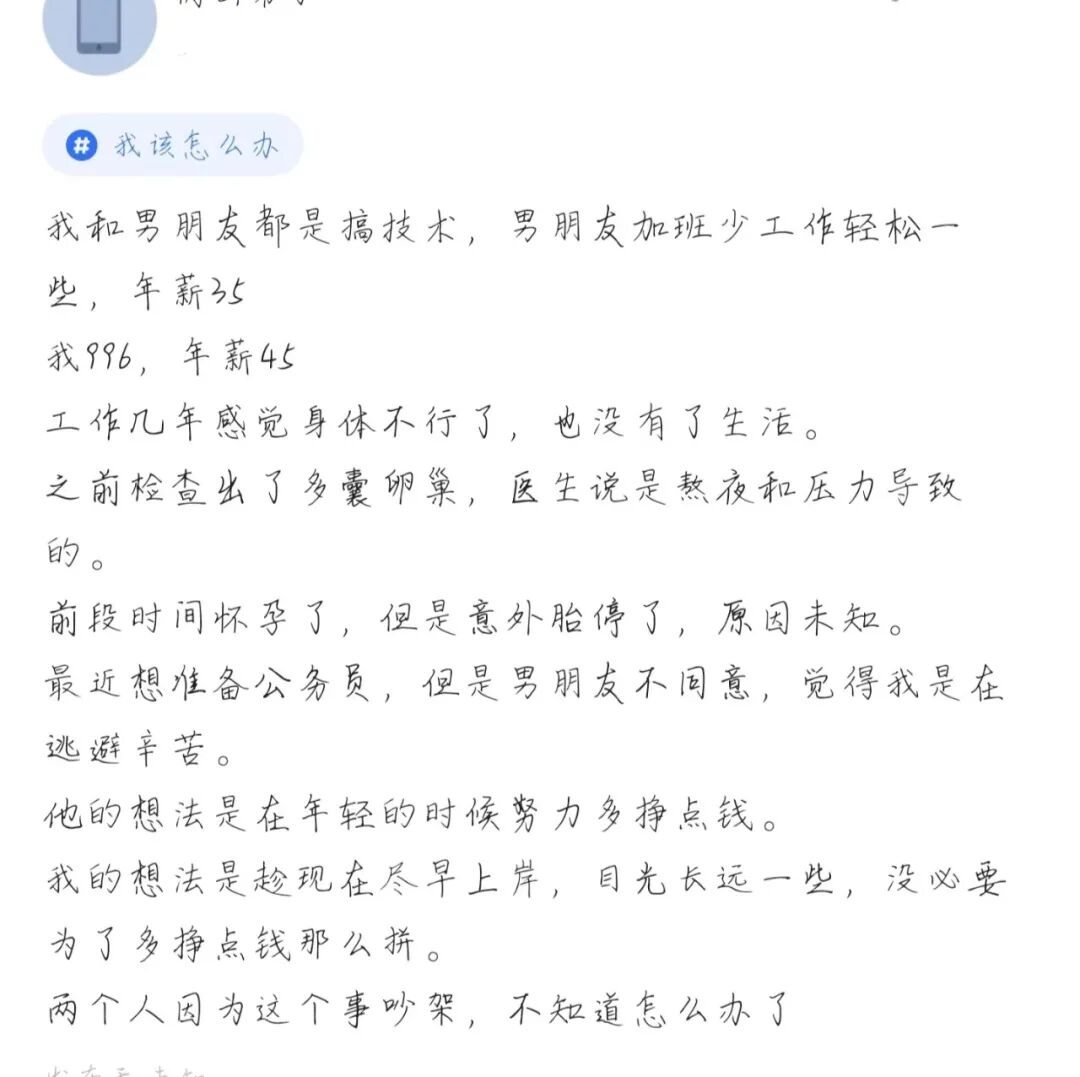 如果两人一起失去工作了,那种压力更大,两个人都搞技术,短期看确实收入更高,长期看优势并不大,年龄越大风险越大,考公的压力也会越大。要做好对冲的准备,好好协商一下,达成一个共识。