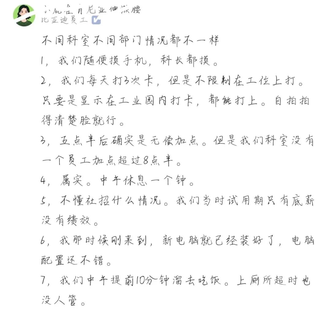 每个人的体验都不一样,不要以偏概全,不要因为你在的部门,而对整个公司进行否定。比亚迪那么大的公司,全国那么多部门,那么多业务,能发展到这么大的规模,就是做对了一些事情,要求研究一些好的东西。