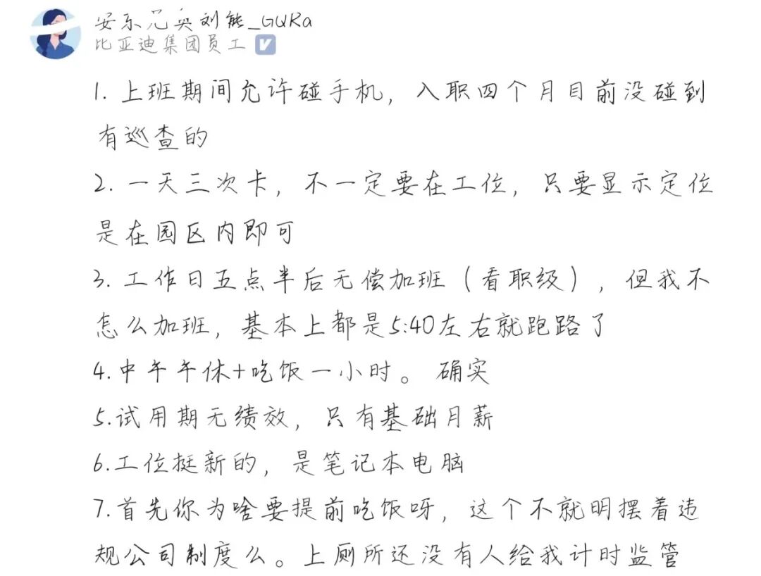 每家公司有好的部门,就有不好的部门,关键看自己遇到什么领导。规则是怎么来的,人为制定的,能否遇到好的领导,就是概率问题。公司和公司好不好,有对比才知道,在比亚迪工作过,再去其他公司,彼此都体验过,才知道哪里相对好一些。锻炼好自己,让自己有机会体验更多公司。