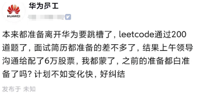华为某员工准备跳槽了,什么都准备好了,结果公司给配了6万股票,你觉得他会离开吗?如果你觉得一家公司有前途,还是要耐得住寂寞,离开平台不一定得到更多,认清自己很重要。