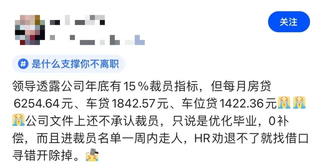 裁员不是大问题,看个人的房贷车贷等才是大问题,如果没有这些,其实被裁未必是坏事,说不定到市场还能遇到好机会,你觉得是祸,也许对有些人是福。怕裁员的人,本身不是工作能力的问题,而是债务的问题。