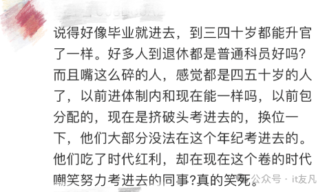公务员只要能考上就行,其他并不是重点,年龄大了,能够考上公务员就比很多人都幸运。有些老同志说,进去是没有前途,都一把年纪了,还谈什么前途,要的就是工作稳定,能工作到退休。