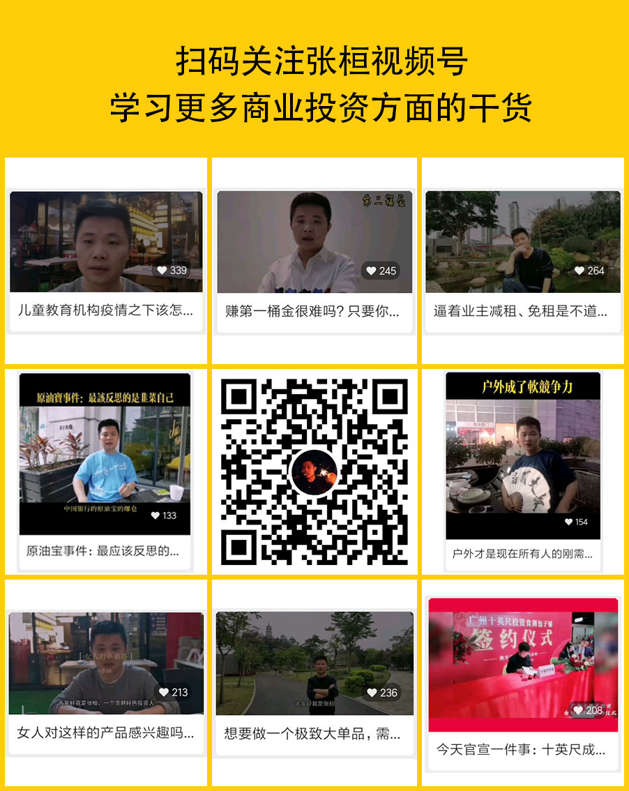 2020,我开通了“视频号”,在视频号里面我会和大家分享一些商业投资方面的心得和感悟,包括分享平时吃喝玩乐这些有趣的事情。可以长按下方二维码关注我的视频号,非常开心和大家见面!