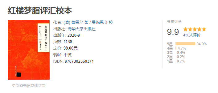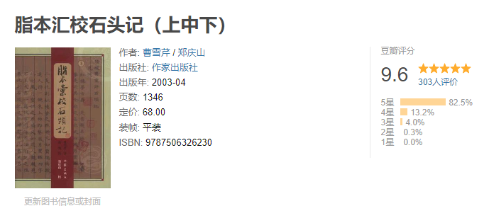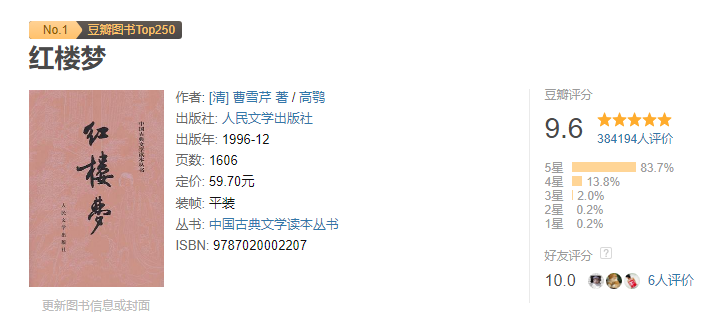 我第一次读《红楼梦》,读的就是人民文学出版社的这个版本,当时的封面还有「高鹗续」的字样,现在已经取消了,改为了无名氏续。目前这套书高居豆瓣评分的第一名。