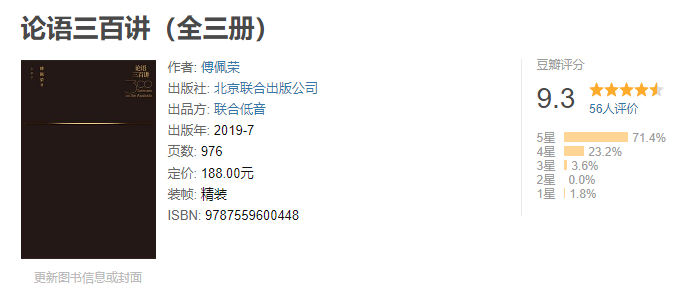 傅佩荣这套《论语三百讲》共三册,936页,66万字,篇幅和《华杉讲透<论语>》差不多,也讲得比较细,目前能把《论语》讲得如此深入浅出的,我只看到这两本。