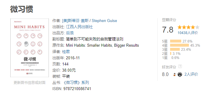 所谓的微习惯,就是很小很小的习惯,我们去做的时候没有多少难度,比如每天看两页书,每天读一篇论文,每天做10个俯卧撑,每天背10个英文单词等,在斯蒂芬·盖斯的这本《微习惯》里就有很多类似的微习惯。