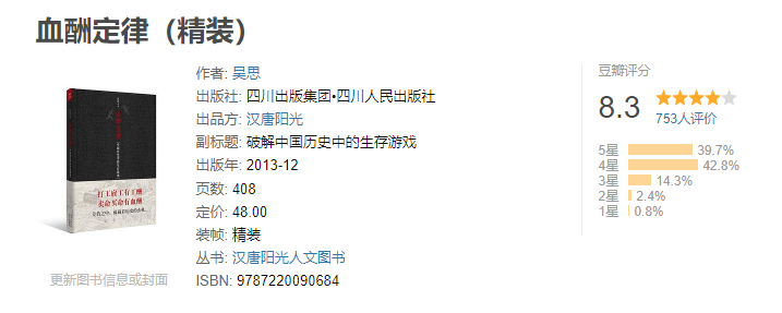 吴思的这本书和《潜规则:中国历史中的真实游戏》都写得非常精彩,一般读其中一本,必读另一本,这里我就只介绍这本《血酬定律:中国历史上的生存游戏》。