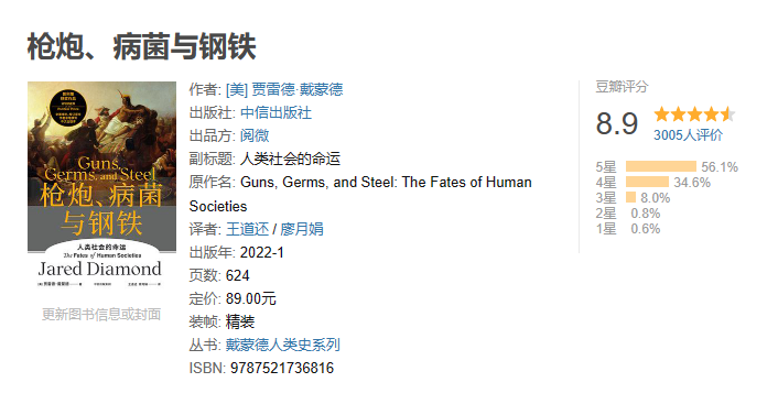 比如他在书中解释了为什么欧洲人持有先进的枪炮和钢铁技术,而非其他地区;还有为什么欧洲人带来的疾病,在新大陆造成如此严重的人口损失等,让你从更宽阔的视野,去看到历史的方方面面。