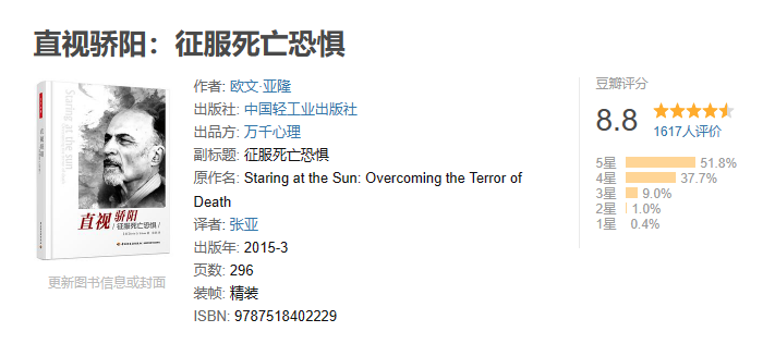 欧文·亚隆的这本《直视骄阳》,主要讲的是人们如何摆脱死亡的恐惧,并重新去认识生命。作为一个精神医学教授,他强调的是觉醒体验,就是一个人只有经历过生死,才懂得珍惜生命,并开始去热爱生活,至少不再对死亡心怀恐惧。
