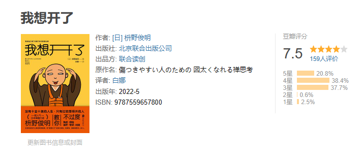 这本书可以说是一本禅学生活指南,作者枡野俊明用浅显易懂的话,让你了解想得开是多么重要。他以自己的自己的亲身经历和思考,教你怎样从不同角度去看待各种困惑和烦恼,让你从日常生活、人际交往和职场等多个方面,培养一种叫「想得开」的态度。