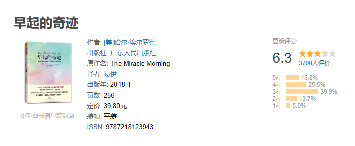 这本书的豆瓣评分只有6.2分,够低了吧?我看了一眼打低分的人,都没有说出理由,因为他们只是为了读书而读书,没有在书中读出自己,根本原因是自己做不到早起,作者戳到自己的痛处了。