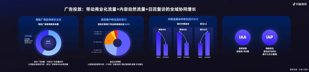 这里在付费成本的降低、和首日ROI的提升上,都取得了显著的收益。我们的IAA产品,在抖音闭环发挥优势,回收快ROI高;IAP产品,则在持续优化首日&7日ROI后,也高于三方小游戏。