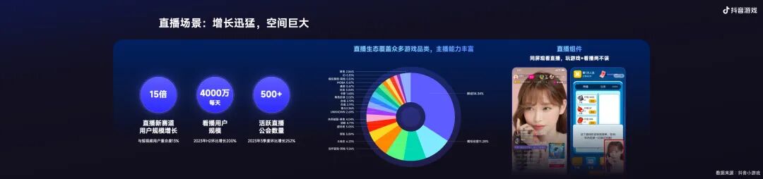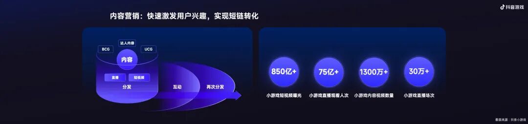 所以,今年我们可以看到,抖音小游戏产生了850亿的短视频内容播放,75亿次直播观看,这里对应背后是1300万达人种草的视频,和今年下半年才刚开始,就产生了30多万场的直播。