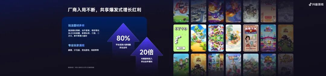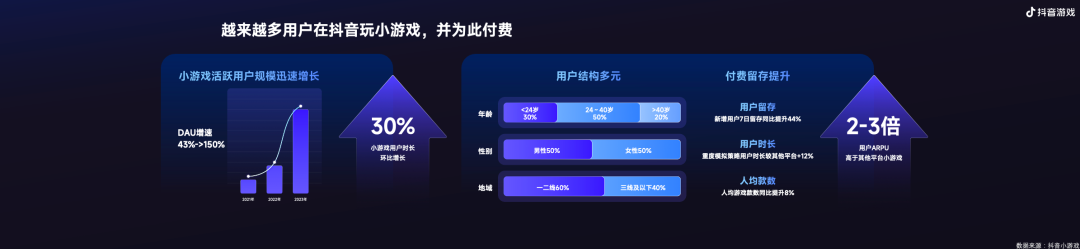 我们再来看一组数据:从用户规模看,小游戏近两年尤其是在2023年的用户增速超过150%,用户粘性也在快速提升。用户结构分布多元,而最具消费力的用户群体如24-40的上班族、一二线城市用户等占比更高。随着用户留存、用户时长以及人均游戏款数的快速增长,内部数据也可以看到抖音小游戏的用户ARPU高于其他平台的2-3倍。