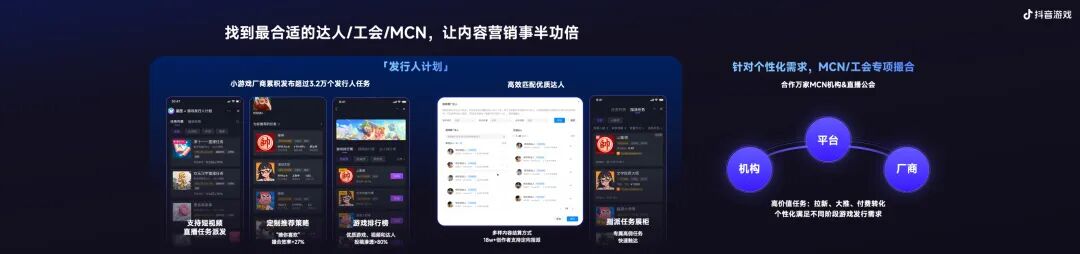 对于有个性化诉求的厂商,我们也提供与MCN机构/工会专项合作的能力,帮助游戏厂商,从拉新、大推、付费转化等不同发行需求中,提供个性化解决方案。