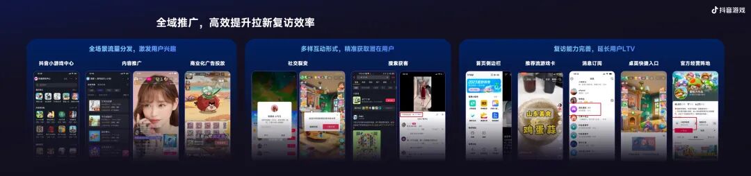 第三部分呢,是很多厂商最关注的抖音复访。这里我想着重讲两个能力:先说说首页侧边栏,今年我们在抖音首页左上角,上线了侧边栏这个入口,让用户能够更快速的访问自己玩过的小游戏。目前我看部分游戏已经开始利用游戏内的教育,鼓励用户通过侧边栏来复访,部分做的好的游戏侧边栏渗透能到35-50%,游戏的留存也因此提升了18%+。长期我们也会持续去投入这个入口的建设,加速用户心智的形成。