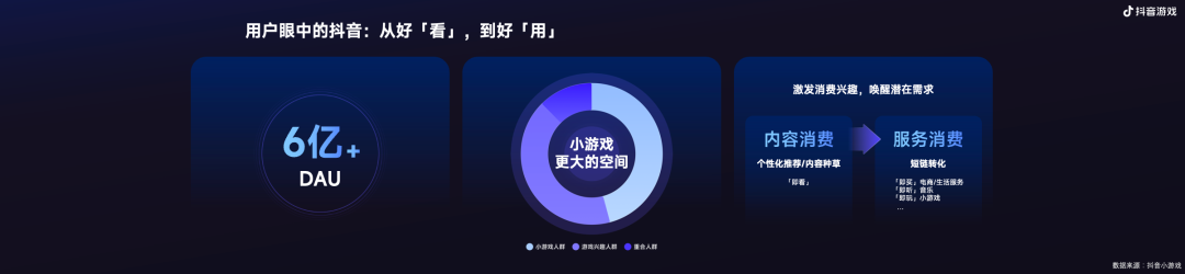 我先带大家来看一组最新的数据,在抖音超过6亿DAU的用户流量中,游戏相关内容消费排列在TOP5,其中重度游戏人群占比37%,小游戏人群占比49%,而这两者的重合度仅仅为14%,由此我们看到小游戏在抖音有更大的用户潜在价值和空间。