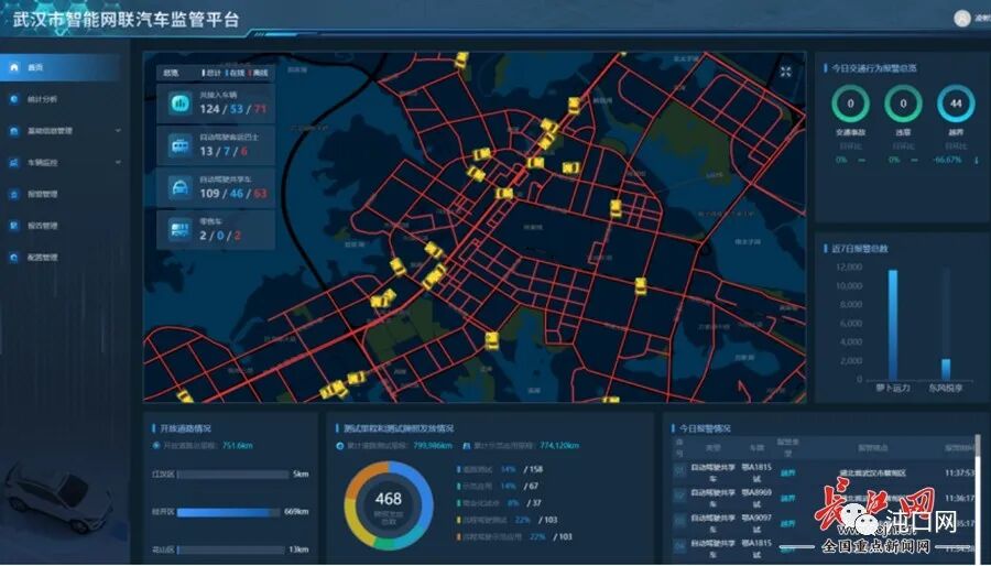 凌彬洋是武汉车网智联测试运营管理有限公司(以下简称“车网智联”)的运营主管,3月6日,他打开智能网联汽车监管平台(以下简称“监管平台”),检查武汉示范区内常态化运营的124台智能网联汽车的驾驶状态、里程情况、报警情况等信息。这是他每天的例行工作。