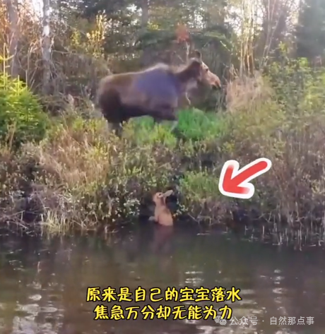 每当他稍微减速,驼鹿妈妈就会急切地向他示意继续前进,仿佛在表达着自己的焦急,生怕他跟不上。走着走着,小哥发现驼鹿妈妈停在河边,原来有一只小驼鹿落水了,驼鹿妈妈之前的行为都是在请求帮助。