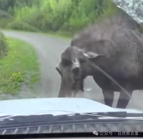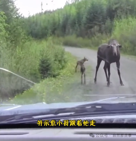 在他惊讶的时刻,驼鹿的妈妈走向前,向他友好地示意跟随她。小哥顿时感到有些疑惑,但还是开车跟随着驼鹿妈妈的步伐。