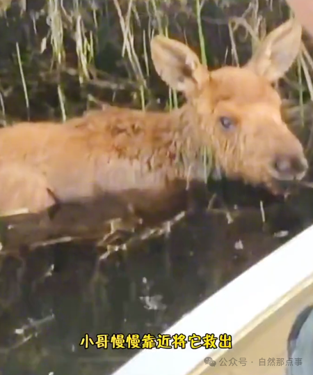 小哥毫不犹豫地跳进河里,将小驼鹿从水中救了出来。驼鹿妈妈与小驼鹿团聚后,朝小哥看去,似乎对他表示了感激。