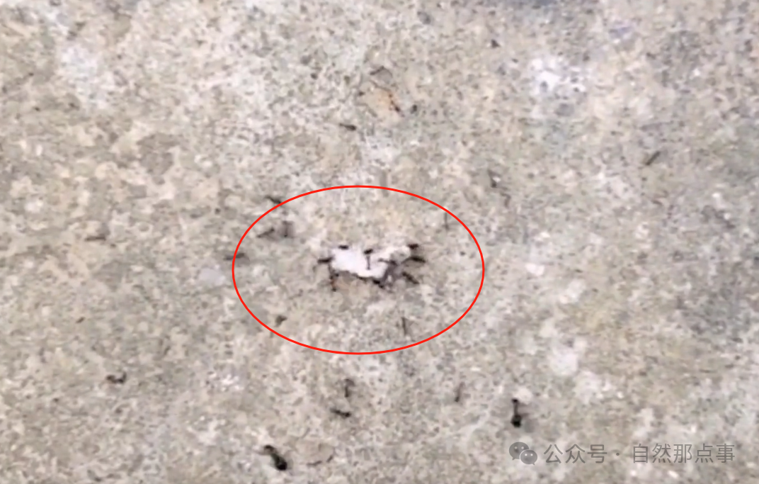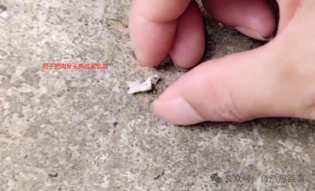 不一会儿,第一只蚂蚁带着几只同伴,再次来到了肉骨头的位置,它们显得很激动,赶紧跑回了巢穴,报告这个惊喜。男子见状,将肉骨头换成了的饼屑,想继续捉弄蚂蚁们。