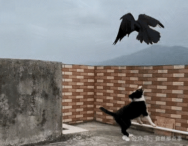 边牧犬立刻对乌鸦产生了兴趣,开始追逐着乌鸦,试图抓住它。乌鸦似乎也很享受这种游戏,它不断地在围栏上飞起来又落下,引诱边牧跟着跳跃,仿佛想要骗边牧跳下楼去。