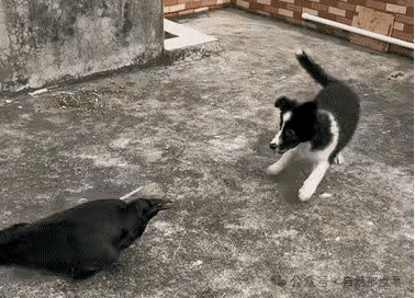 很明显,乌鸦想吃狗肉了。如果乌鸦会说话,肯定会疑惑:怪了,上次一只黑白的还要大一点的狗怎么一下子跳下去了。