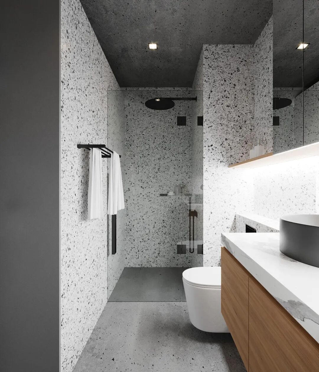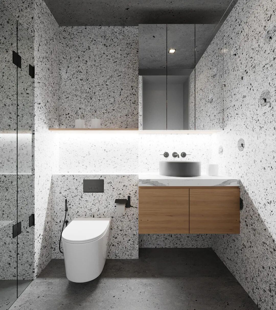 洗手间大面积水磨石瓷砖的铺设沉稳低调又有设计感,隐形地漏的加入更是平添了一抹简约现代之气。