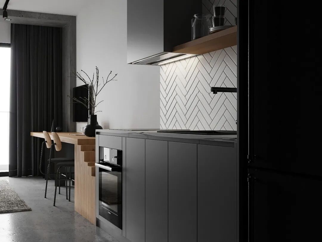 “工字”纹瓷砖的小面积铺贴,是开放式厨房的背景墙,既防油又好擦洗,内嵌式烤箱不过多占用空间,却大幅度提升了“一人食”餐桌的丰富程度。