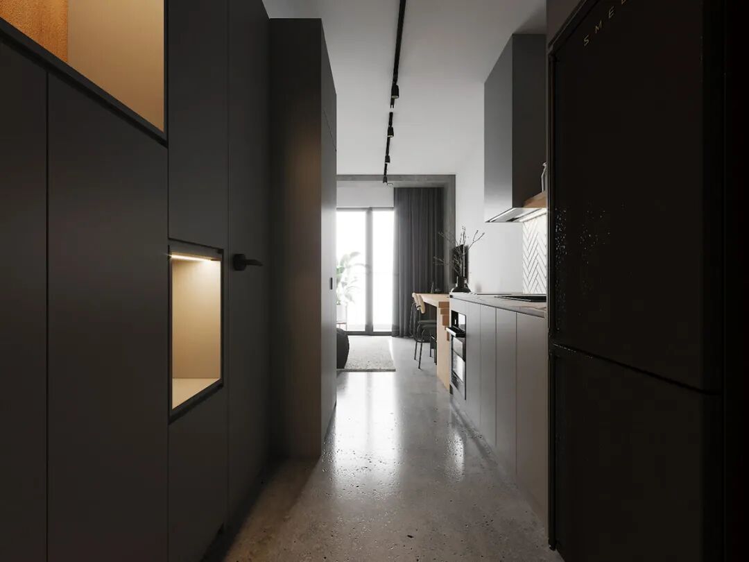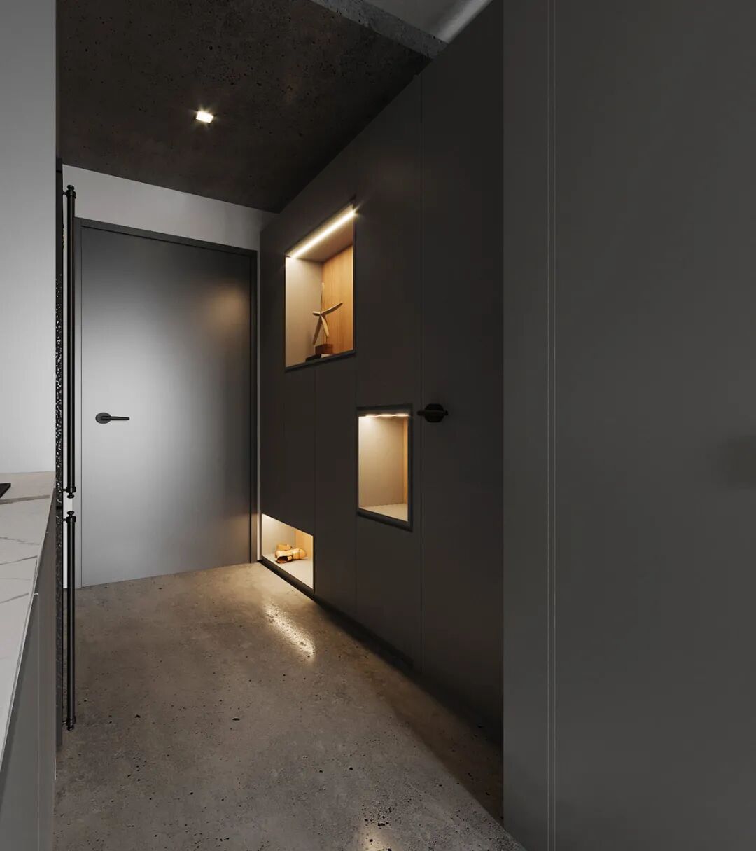 “初极狭,才通人,步行数十步,豁然开朗”这句描写进入桃花源的句子,用在这里意蕴也极为合适。推门进去,是个狭长通道,手边两侧是加了壁龛照明的收纳柜和大冰箱,满足业主一人从内到外的全面收纳。