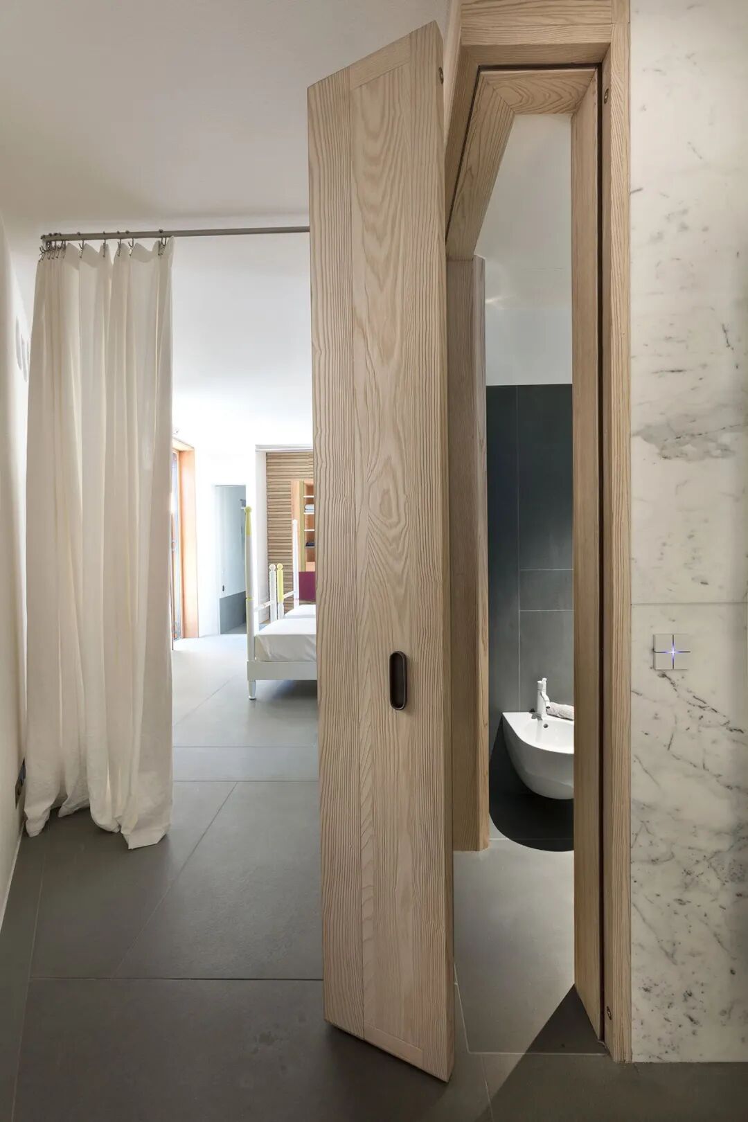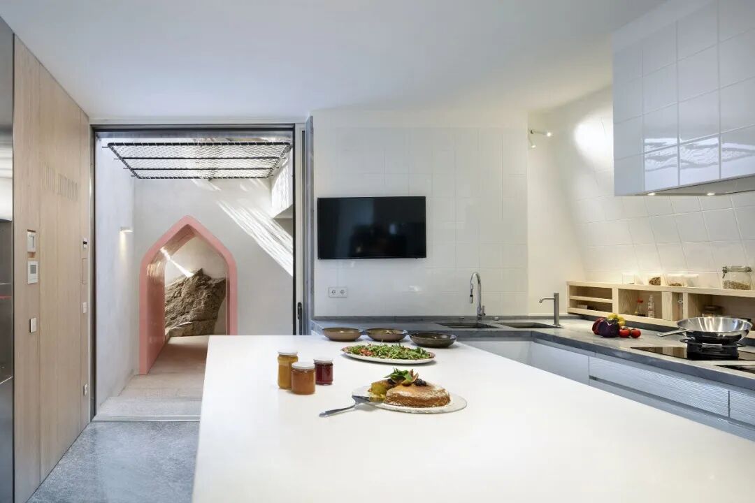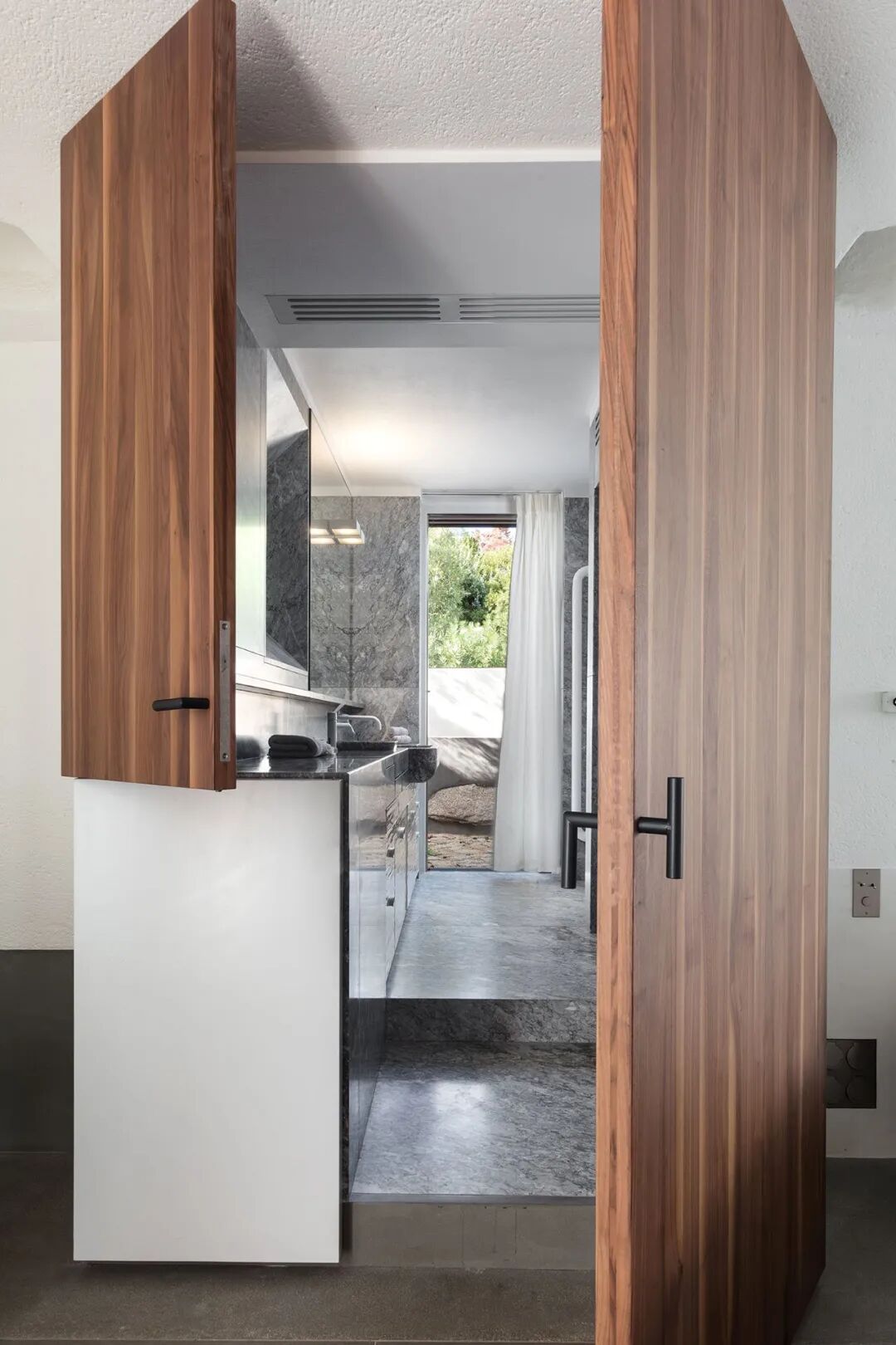 石膏墙和花岗岩瓷砖等粗糙饰面与锡釉瓷砖制品交织在一起。 家具的漆面为原本柔和的白色石膏、灰色石材和天然木材增添了新的色彩。