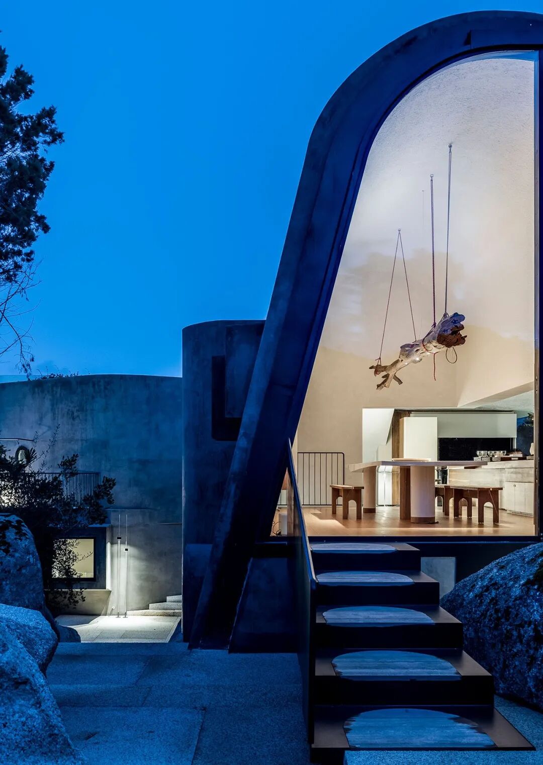 该房屋的内部与建筑外观一样,具有戏剧性的雕塑外形和拱形天花板,宽阔的窗户可提供广阔的视野。