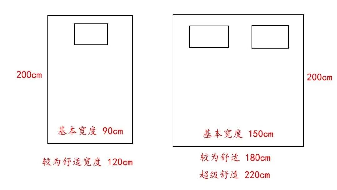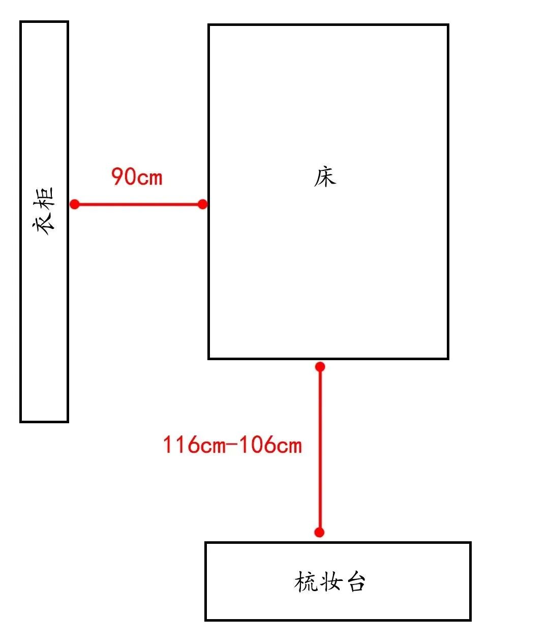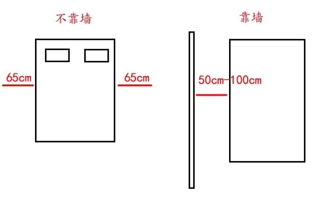 床两侧不靠墙,周围要留65cm方便走动。如果有一侧靠墙,靠墙的一侧要留50~100cm,方便铺床。