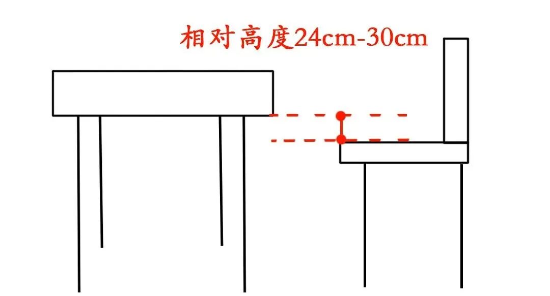 餐椅高度与餐桌底部间距在24cm-30cm即可。