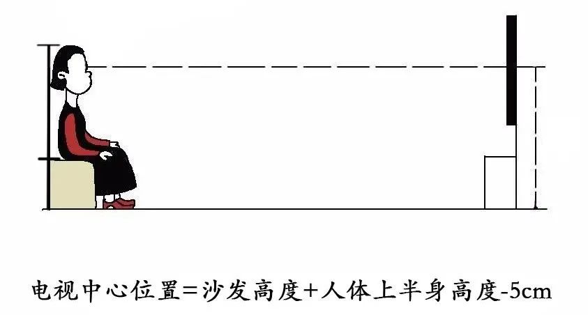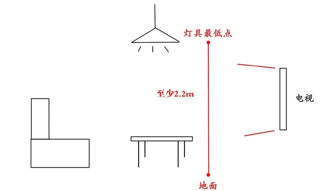 吊灯最低点离地不低于2.2m,这个距离大于电视张开的5º角,不会产生眩光。