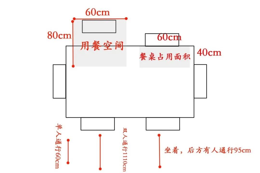 一人用餐宽度60cm,深度80cm,占据餐桌桌面约为40cm×60cm。