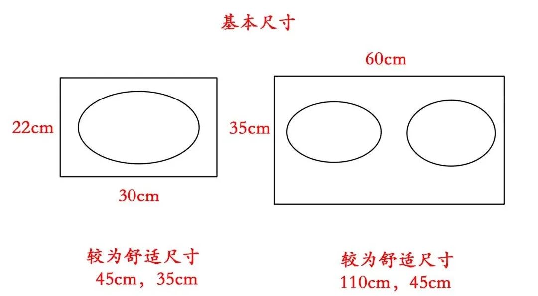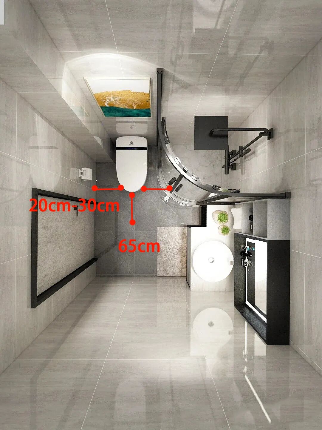 马桶两侧留20~30cm,坐着取物距离适宜,建议预留插座。前方至少留65cm,方便站起走动。
