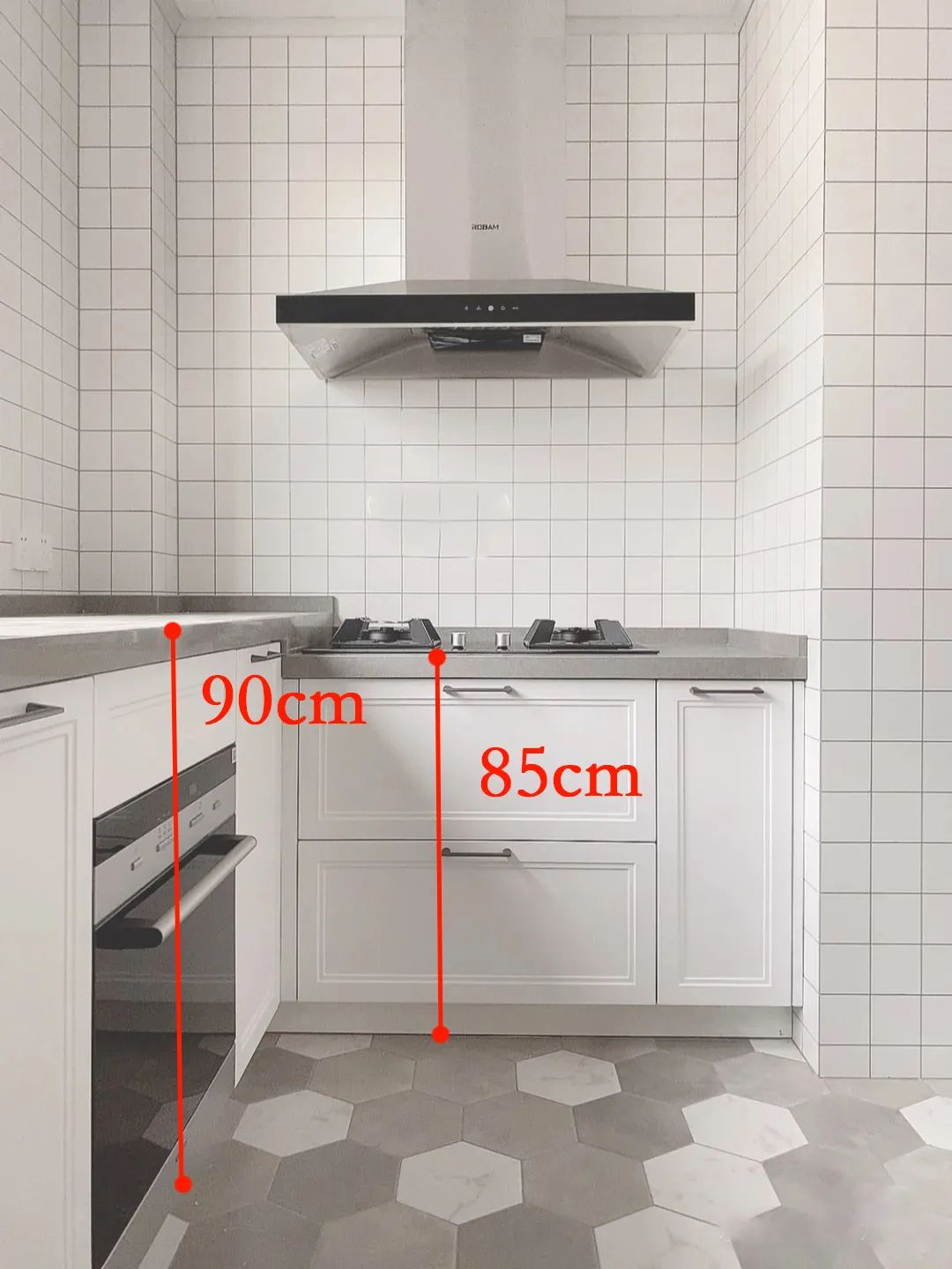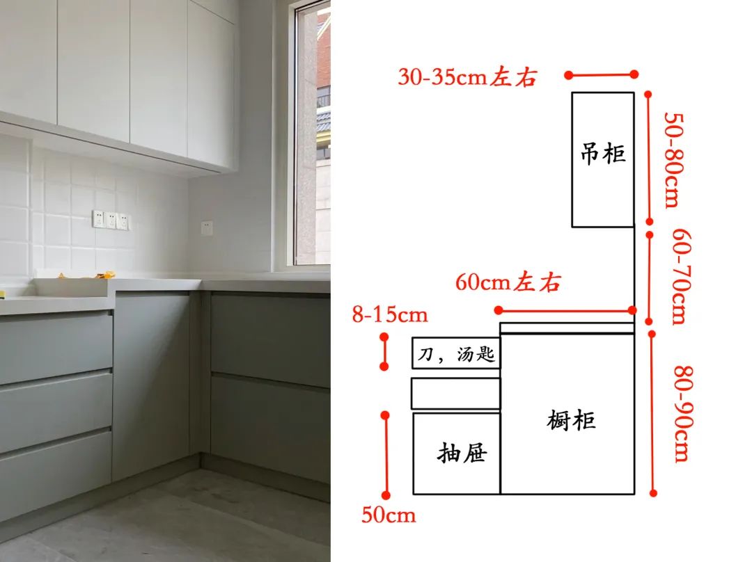 下方橱柜深度60cm左右,以能放下水槽且略宽最好,台面高度为身高÷2+(5cm~10cm)。