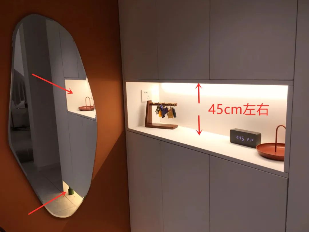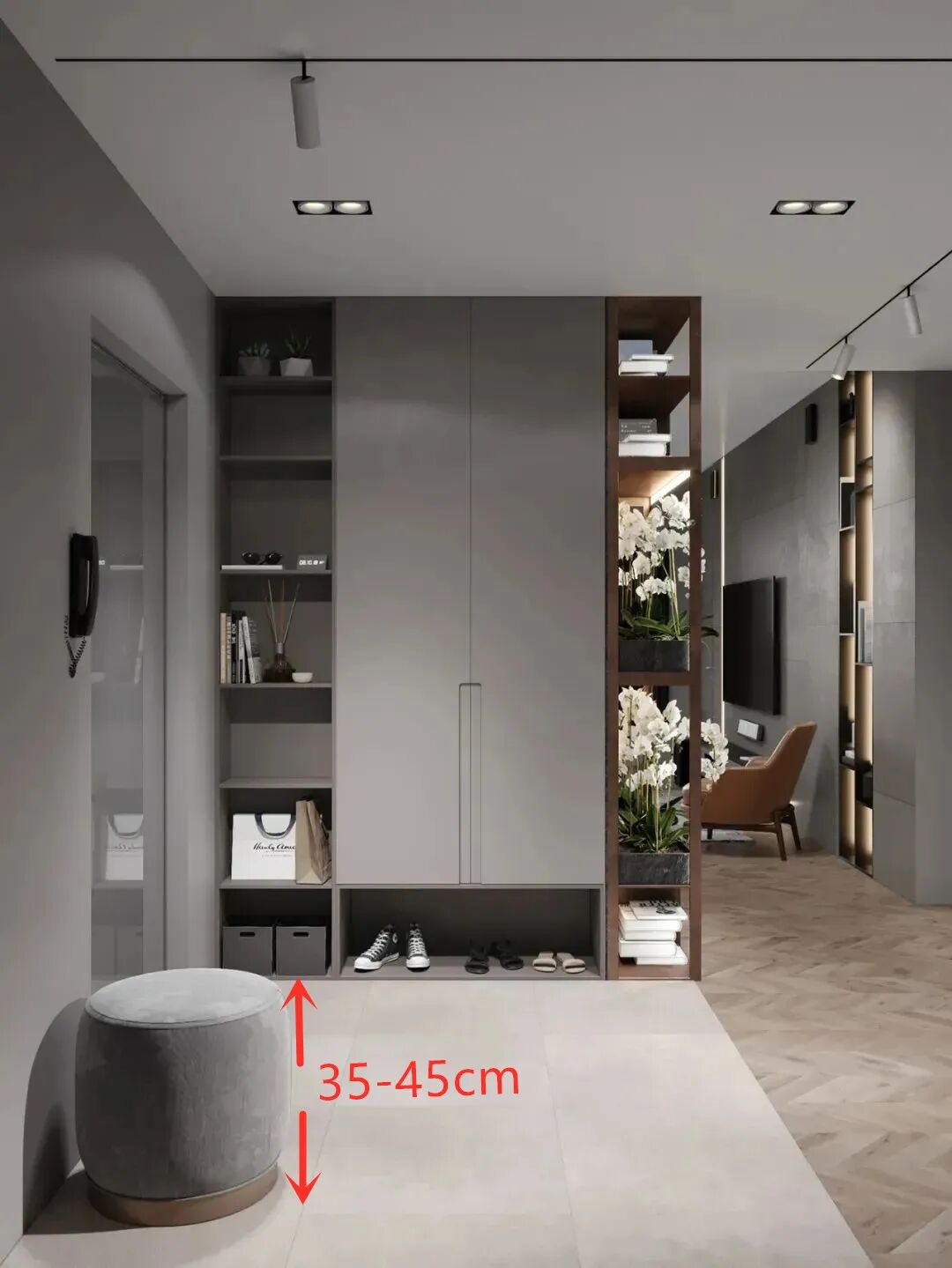 鞋柜中间留空高度45cm左右,方便拿放钥匙、卡、雨伞等杂物。