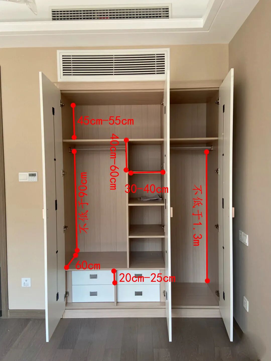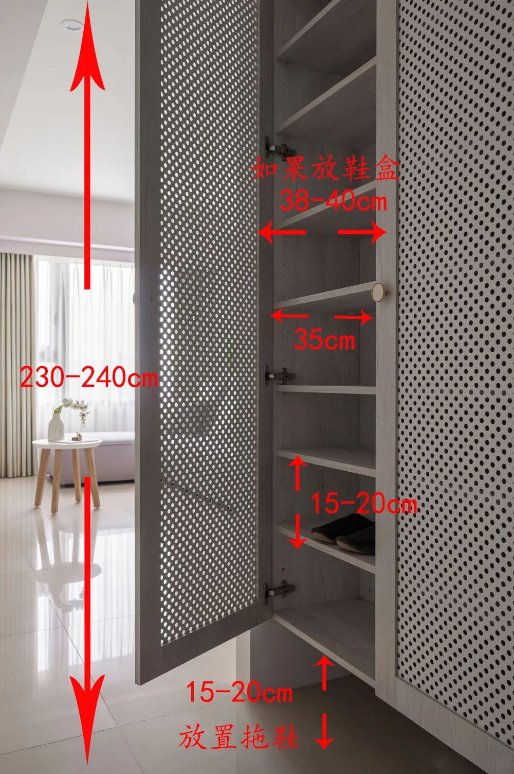 与地面之间留15~20cm空隙,方便放置常穿鞋。层板之间高度15~20cm(可活动层板方便调节)。