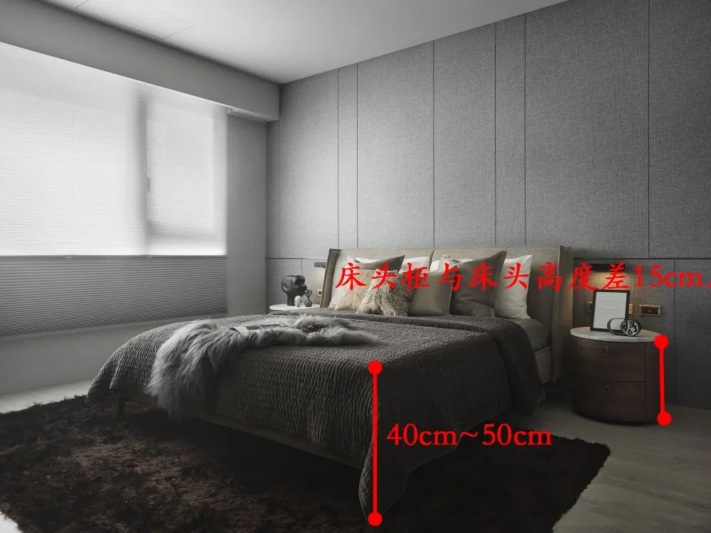 床的高度(加上床垫的高度)建议40cm~50cm,这样坐床沿时刚刚好~床头柜一般和床高(加上床垫的高度)差不多,高于或者低于15cm都可以。