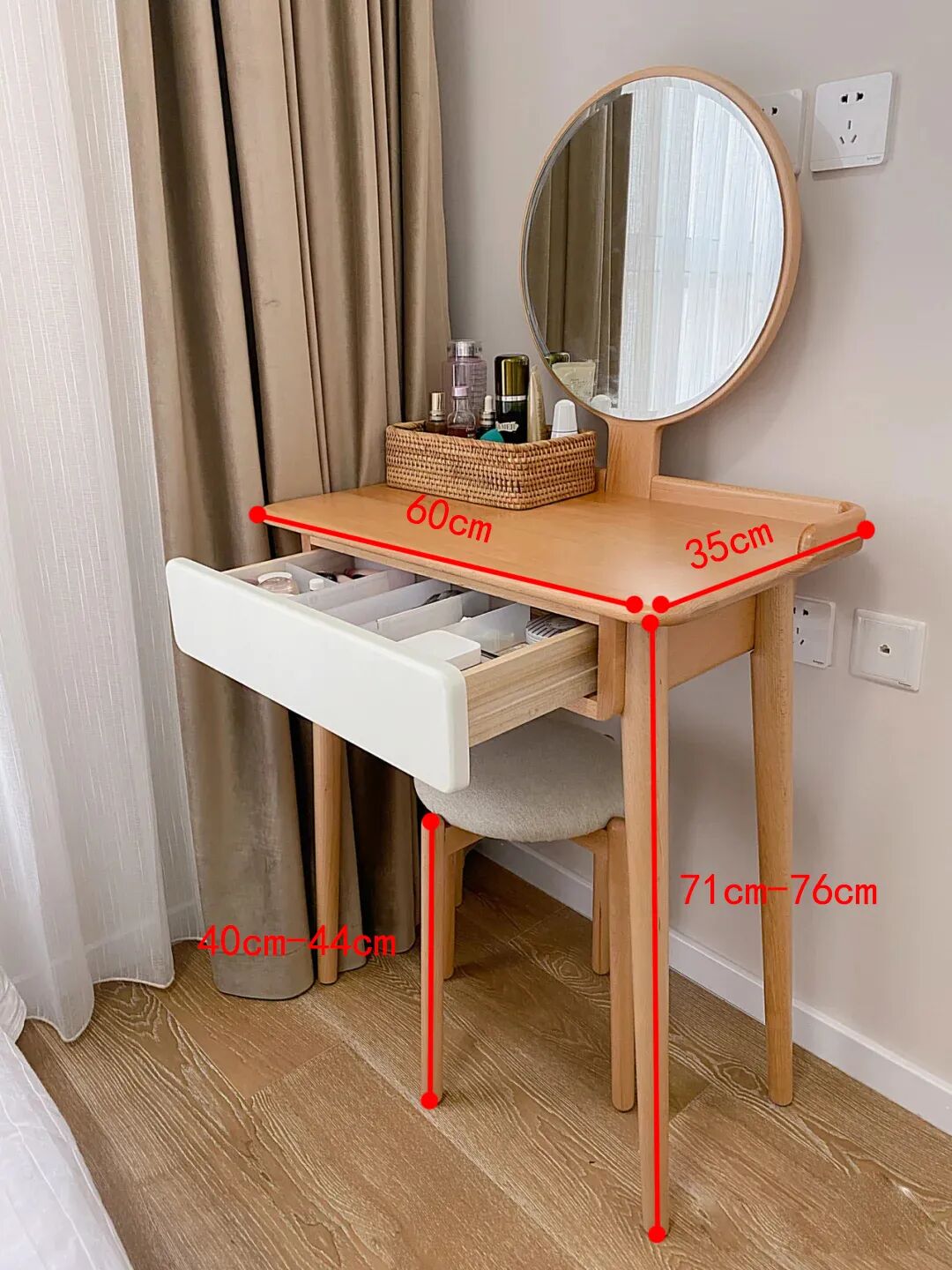 高度建议71cm~76cm,面积建议长76cm,深45cm,梳妆凳高度40cm~44cm。