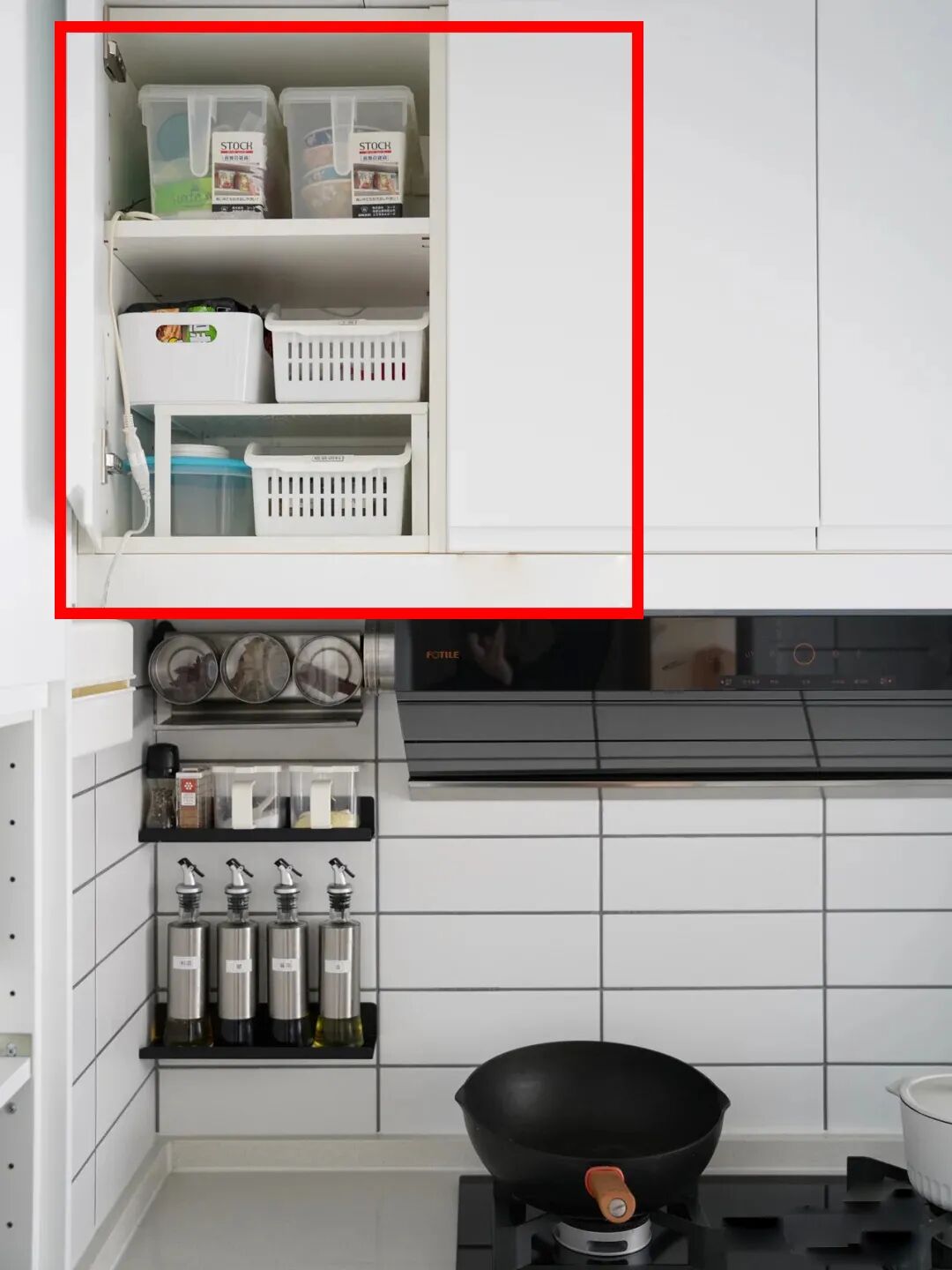 吊柜建议采取开门或上掀式打开方式,内搭活动隔板,便于因物品形状加以调整。