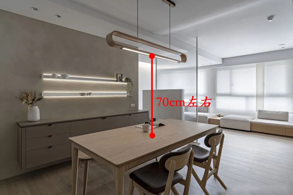 吊灯与餐桌距离70cm左右,可根据层高自行调整。注意灯的长或宽不能超出餐桌。