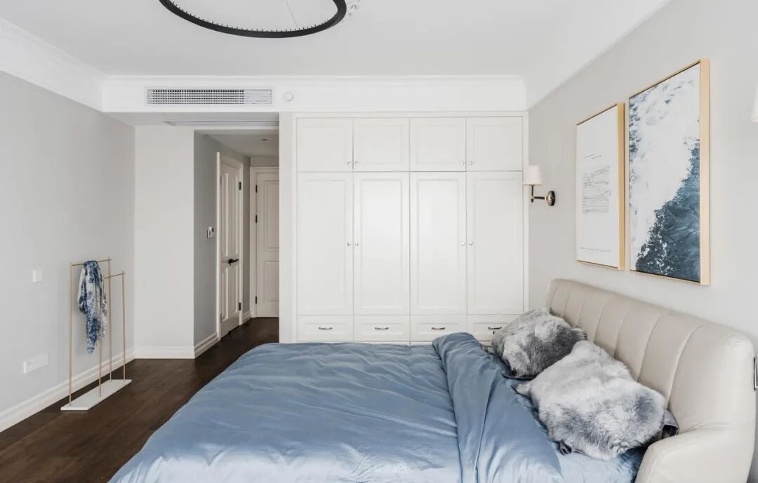 最能令人感到轻松愉悦的要数卧室空间,步入卧室,清新脱俗的灰白与淡蓝将思绪拉向遥远的海边,空间中仿佛拂过清新的风,温柔而沁心。