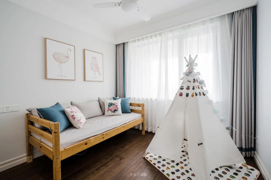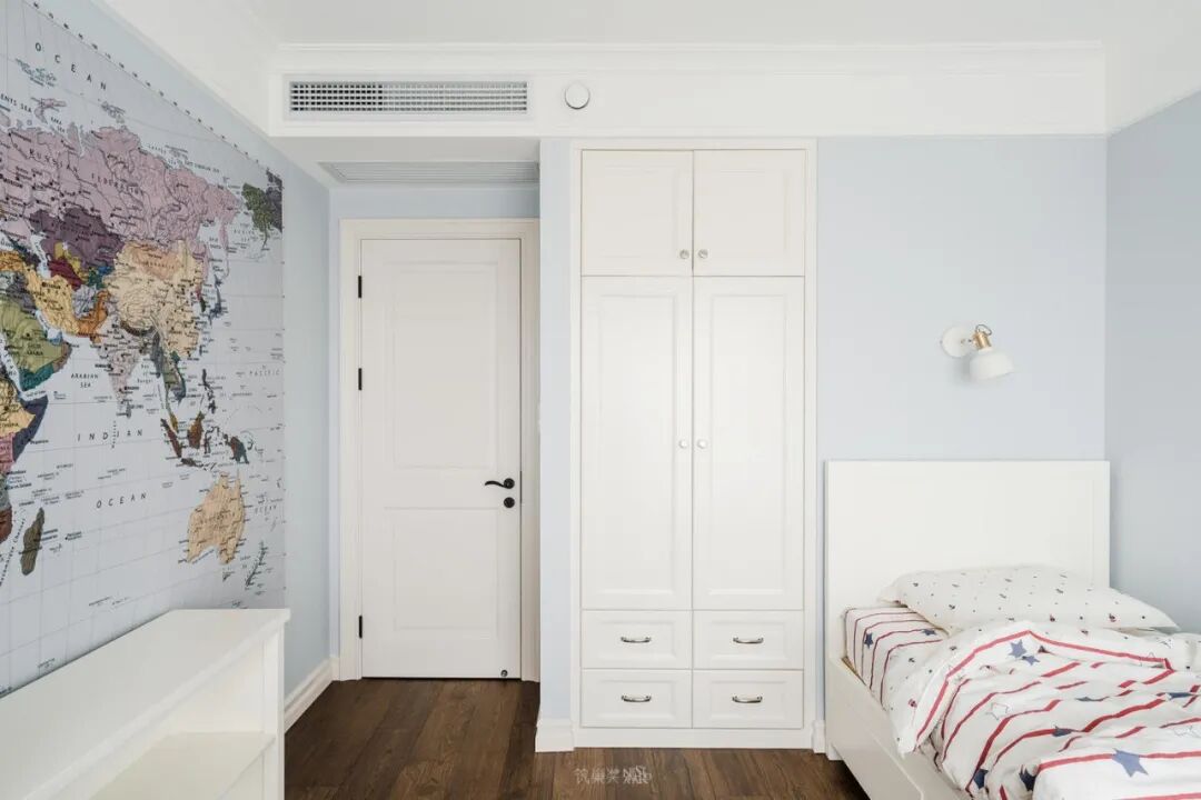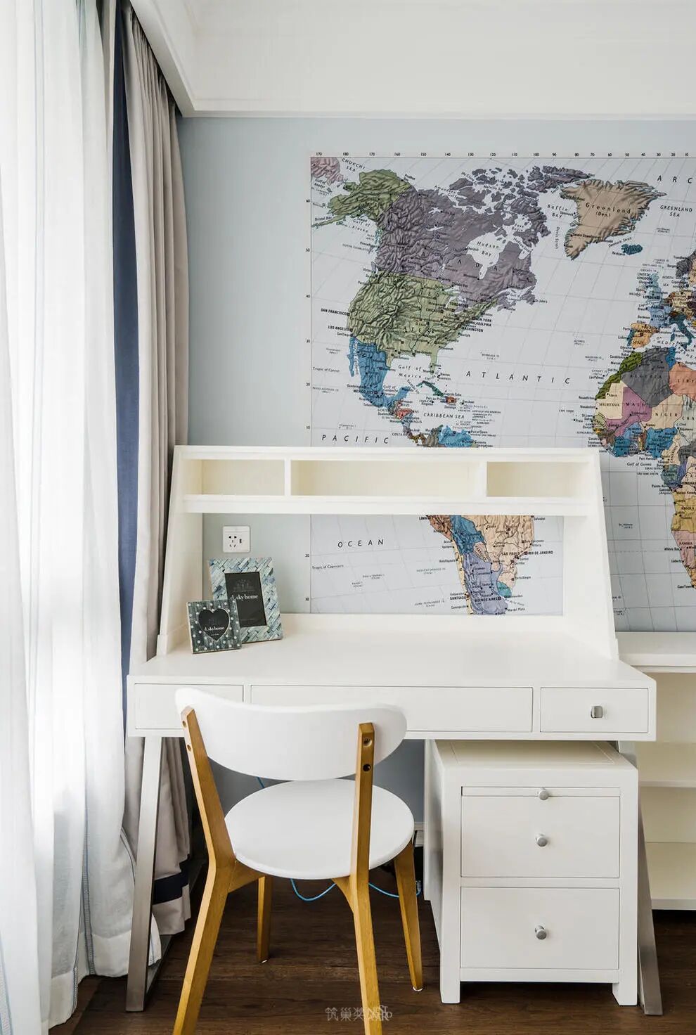 男孩房注入了环球旅行的元素,大幅世界地图充满整个墙壁,书桌、床体、衣柜都沿用了白色,使空间宽敞明亮,利于孩子阅读学习。而女孩房则考虑年龄尙小,搭建了一个小型居家帐篷,主要用于玩耍娱乐,而旁边的双人书桌则利于孩子的学习交流,同时开阔的落地窗景也为空间提供了充足的采光。