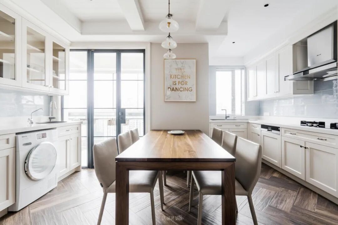 与客厅相对的另一侧是餐厨空间,为了提高空间的利用性,设计师将厨房空间扩大,与餐厅融为一体,在厨房场景下,家庭成员的配合也可以促进成员关系。