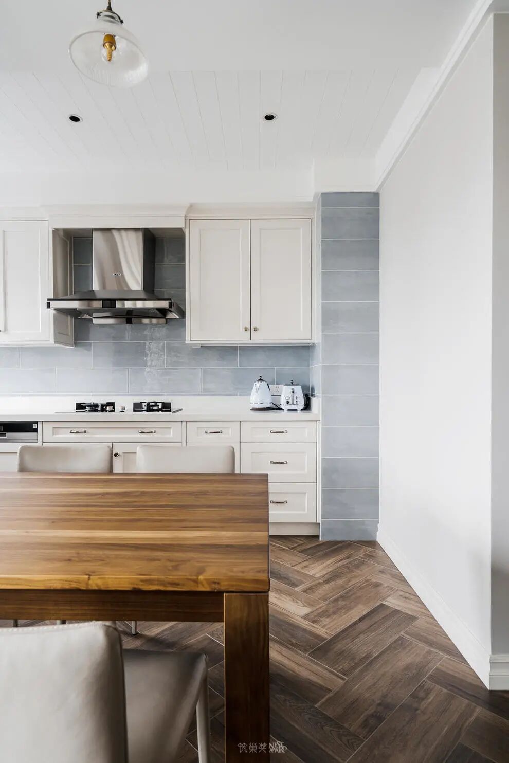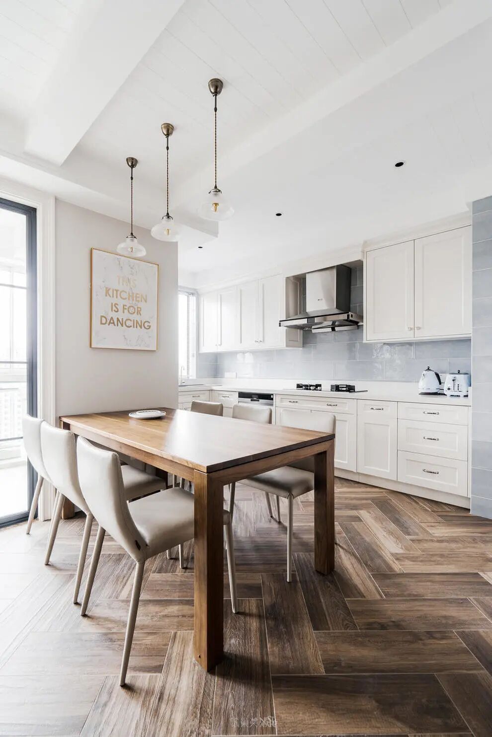 延续了客厅的风格,同样以白色为主,增加了餐厨空间的明亮感,用餐区的实木餐桌及灰白色餐椅,显得低调而内敛,似是北欧田园氛围带入空间。不同材质的墙面与顶面,也区分了不同功能分区。